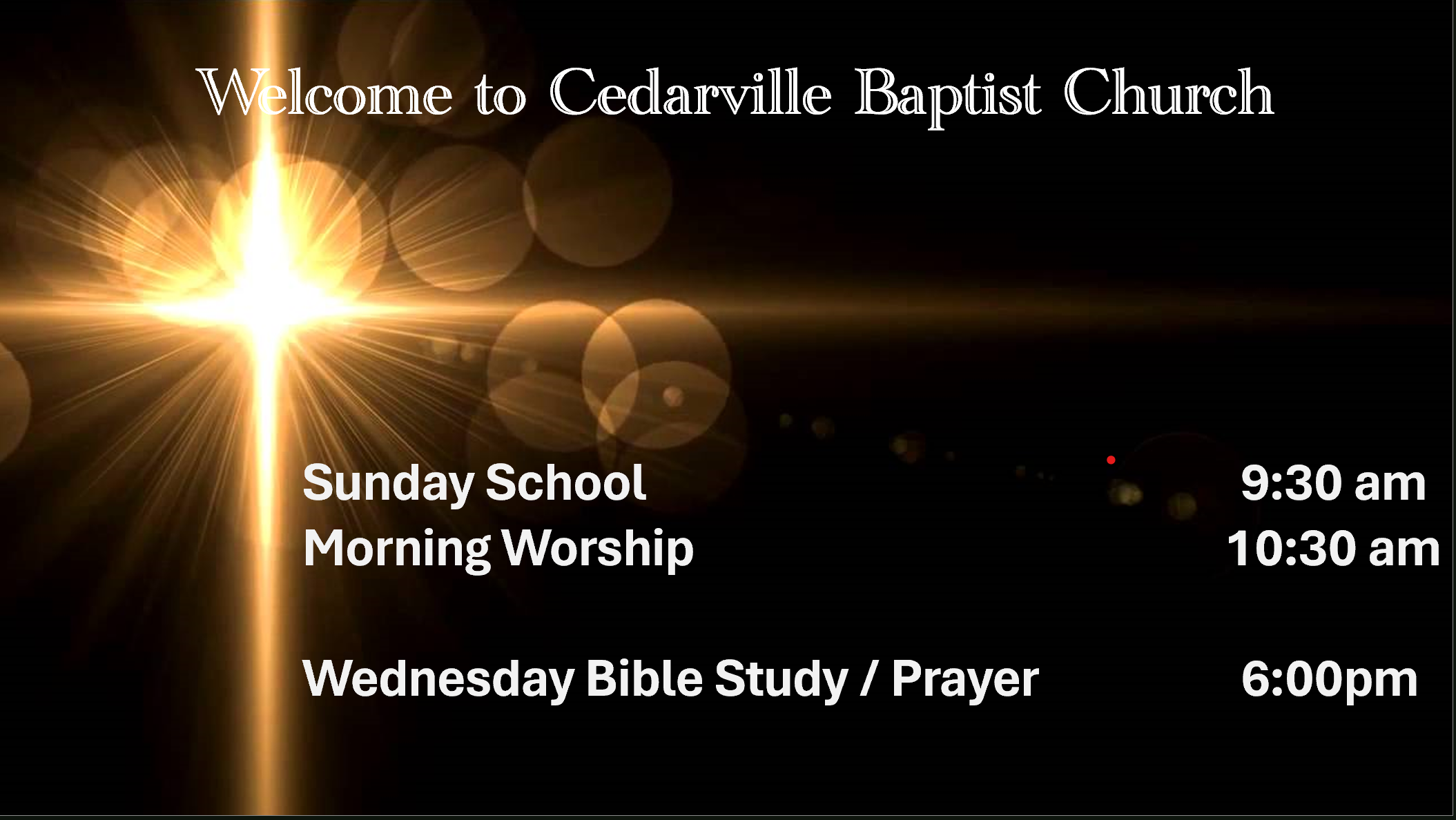Sunday school 9:30 AM, Morning Worship 10:30 AM, and Evening Worship 6 PM