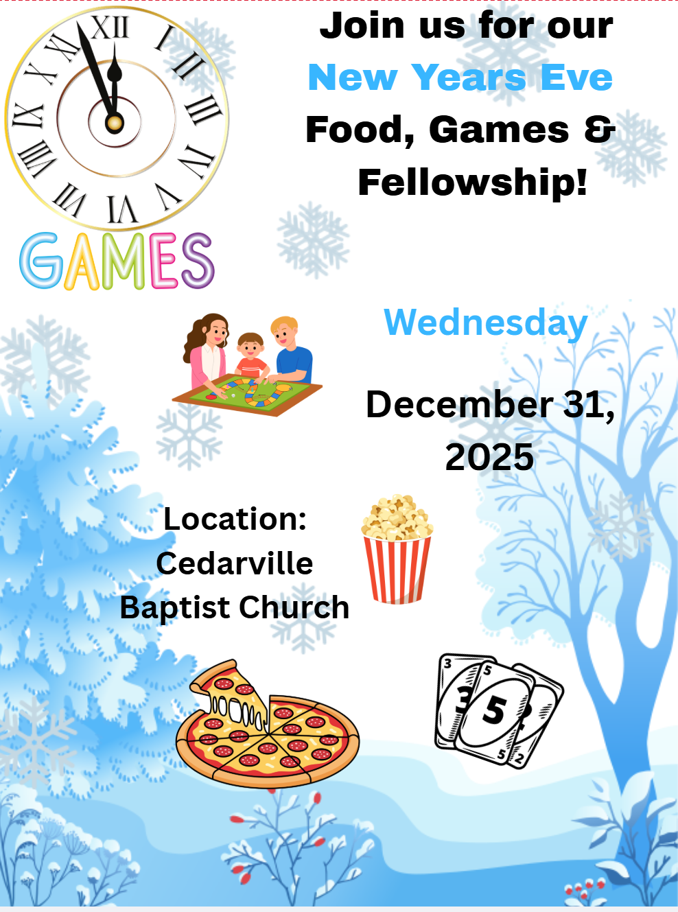 Join us for New Years Eve for games and food and a devotional! Bring a dish to pass. Pizza will be provided! Starts at 5:30 p.m.
